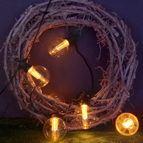 La Guirnalda de bombillas LED combina el encanto clásico de las bombillas tradicionales con la eficiencia y durabilidad de la tecnología LED moderna. Diseñada tanto para uso profesional como doméstico, esta guirnalda está lista para su instalación directa e incluye alimentador y bombillas integradas. Es perfecta para crear ambientes cálidos, acogedores y llenos de estilo en cualquier entorno. La guirnalda cuenta con un cable de 10 metros del que penden 20 bombillas de plástico transparente en varios diámetros Ø 50, 60 o 80 mm, cada una con un filamento LED en su interior. Incluye un cable de alimentación de 4 metros con transformador integrado. Su diseño reproduce la apariencia de las bombillas vintage, pero con la eficiencia y seguridad de la tecnología LED. Las bombillas son fijas y no reemplazables. Cada casquillo dispone de una anilla para instalación sencilla en paredes, pérgolas o estructuras. Fabricada con cable de caucho negro profesional y protección IP65, esta cadena luminosa es resistente al agua y adecuada tanto para uso exterior como interior. Su estética versátil combina a la perfección con entornos bohemios, modernos o rústicos, y ofrece una iluminación decorativa ideal para eventos, terrazas, jardines, restaurantes, bodas o carpas.
