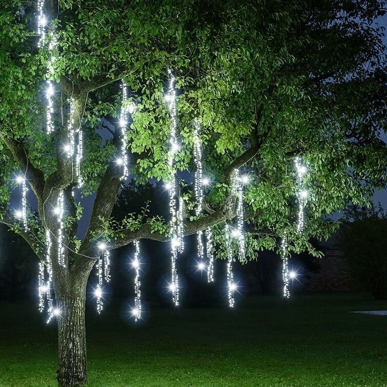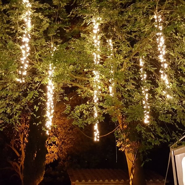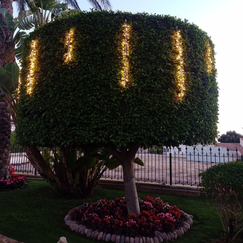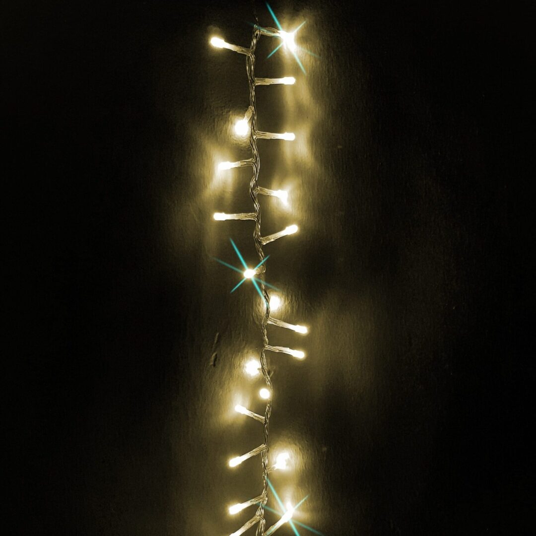 Se pueden colocar en posición vertical creando un efecto similar a lianas de luz cayendo de los árboles o del techo, dando un toque mágico a cualquier espacio. Esta guirnalda llamada “cluster” o «festón» tiene más número de miniLEDs que las guirnaldas convencionales, agrupados de forma irregular, generando una sensación de mayor densidad lumínica y un brillo más intenso. Perfecta para decoraciones impactantes y dinámicas.