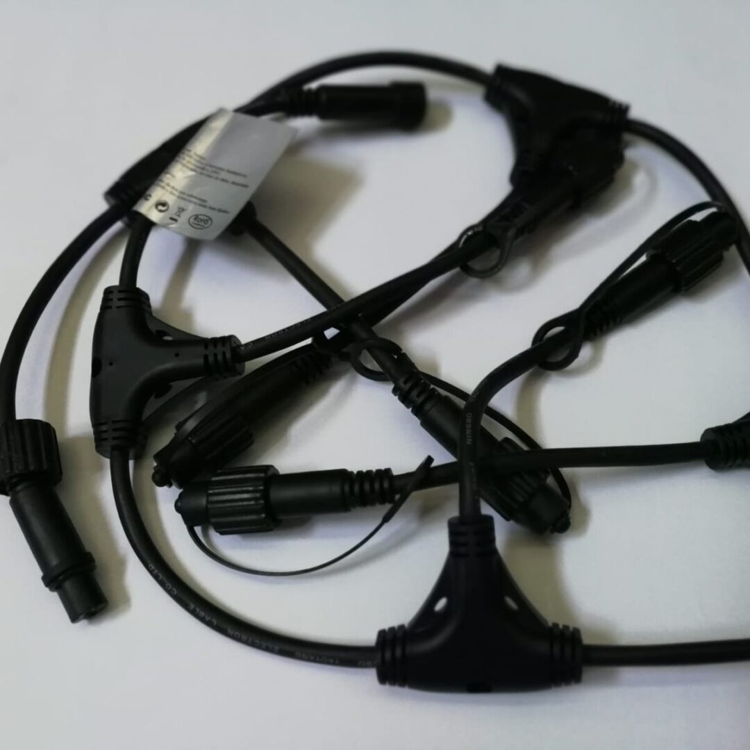 Está disponible en varias alturas diferentes: 0,75 m, 1,25 m y 1,75 m, adaptándose fácilmente a la estructura o espacio a decorar. Cada set incluye una alimentación, 5 guirnaldas verticales y un accesorio distribuidor horizontal de 5 m con 5 salidas de separación entre ellas cada 1 m con cable negro, que permite instalarlas en línea recta o en caída.